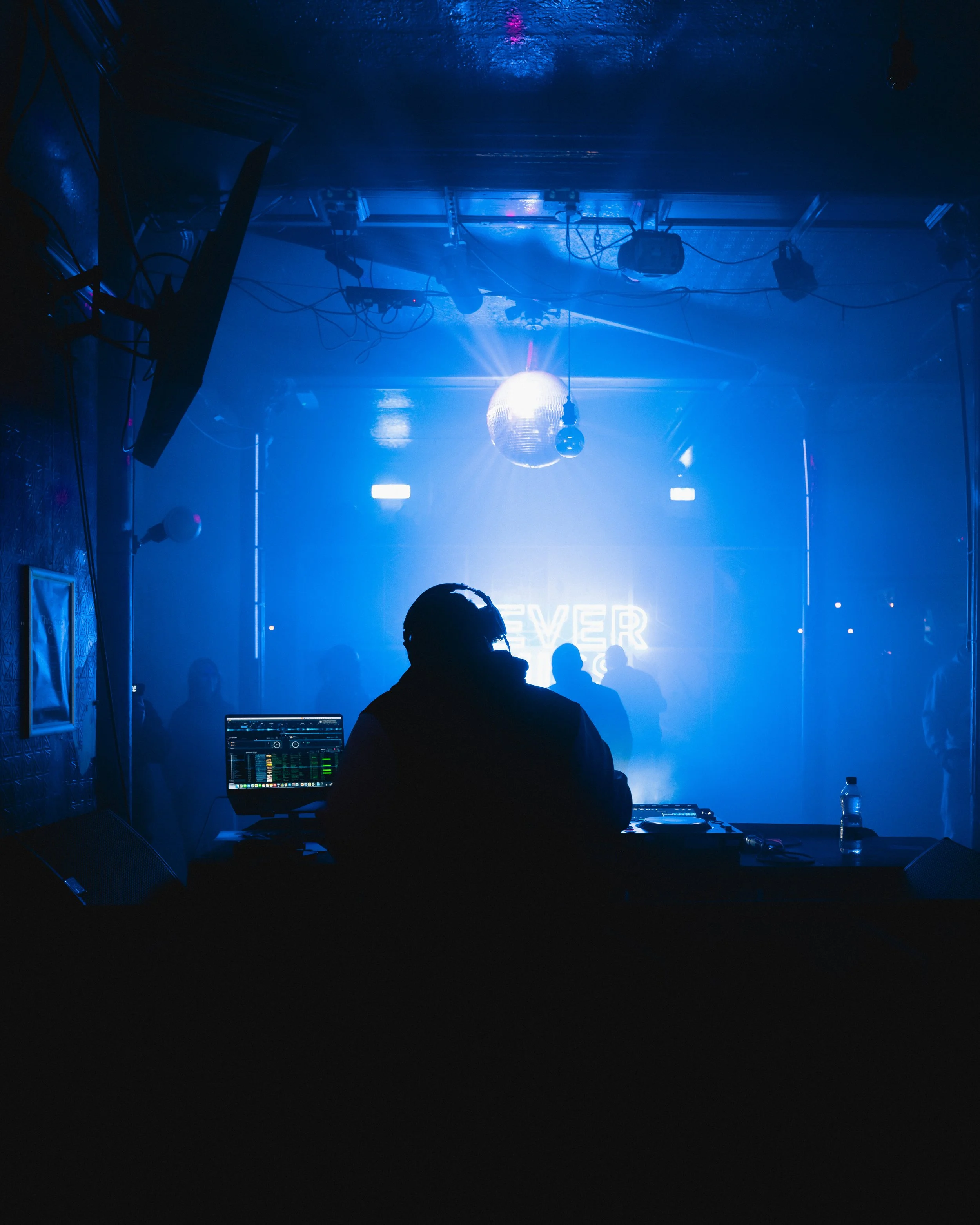 DJ performing in dark club with blue lighting and smoke, surrounded by silhouettes of people, a laptop, and a disco ball.