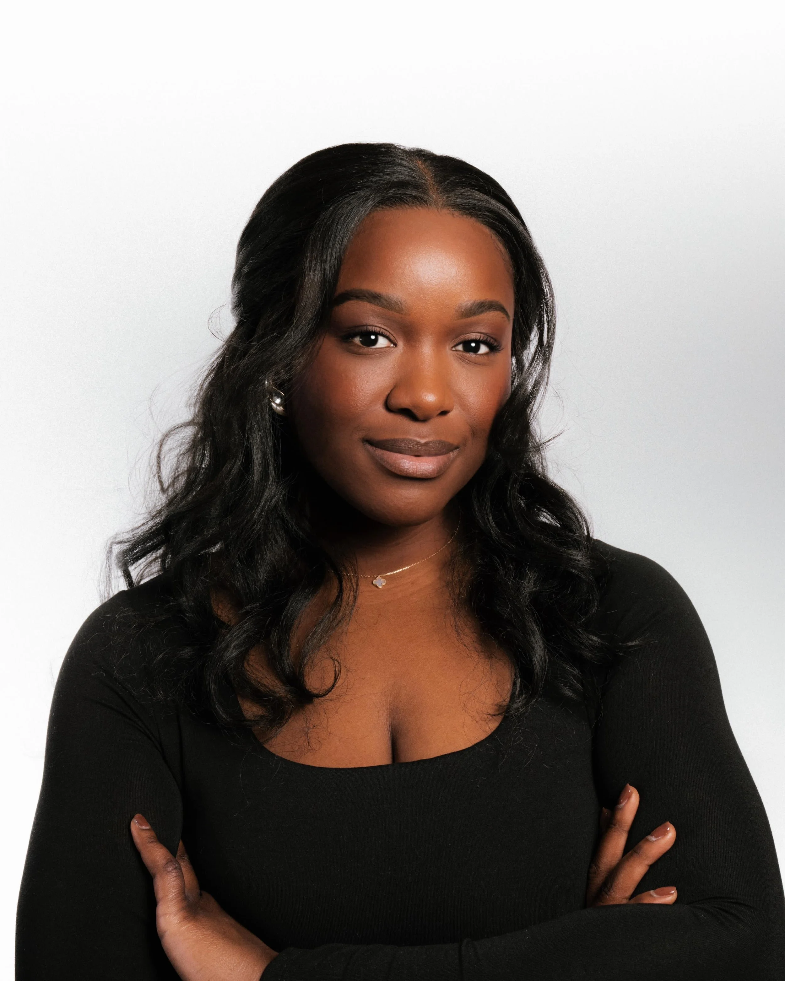 Portrait of a woman with long black hair and a black top, arms crossed, against a white background.